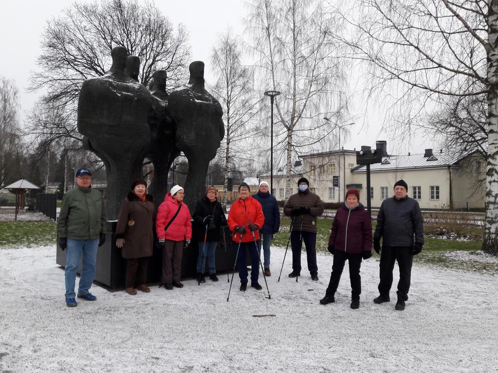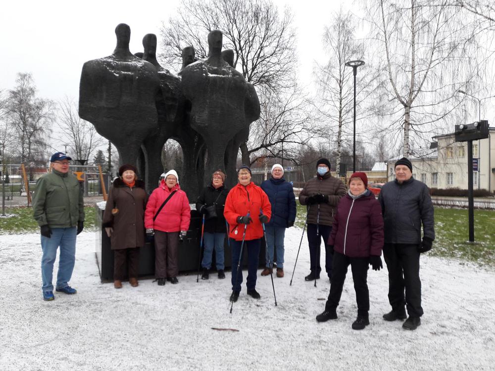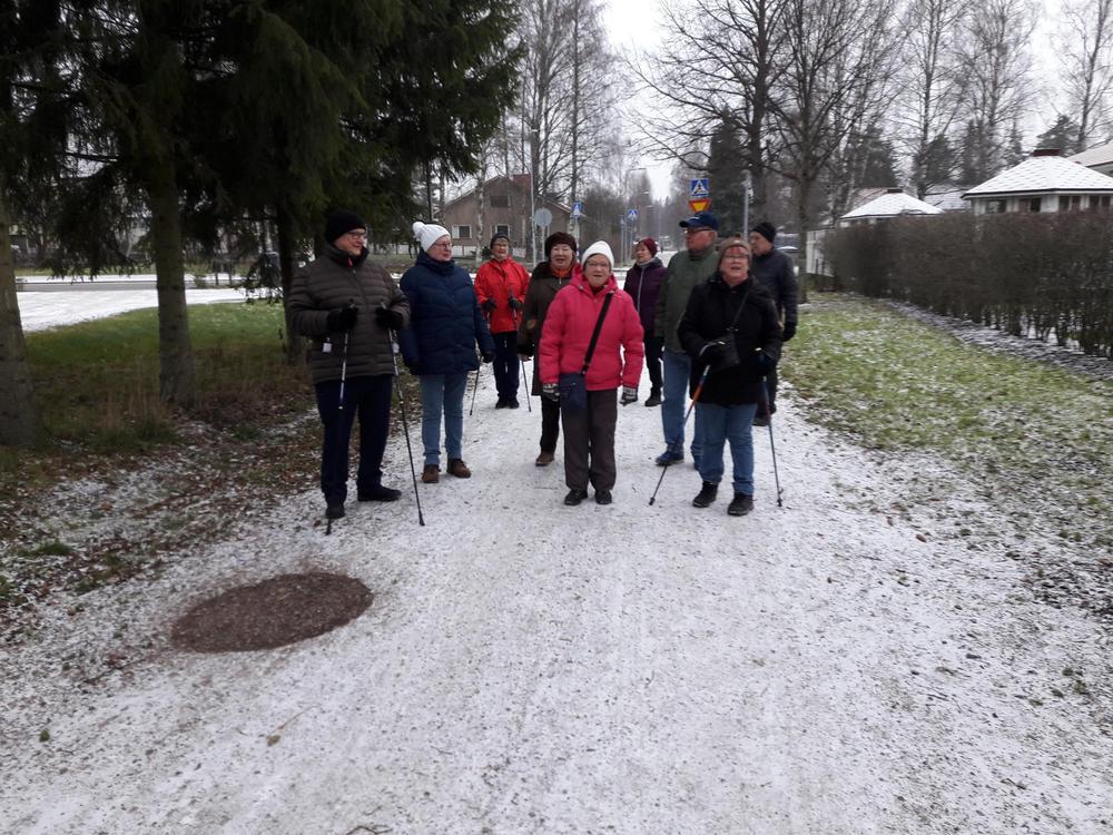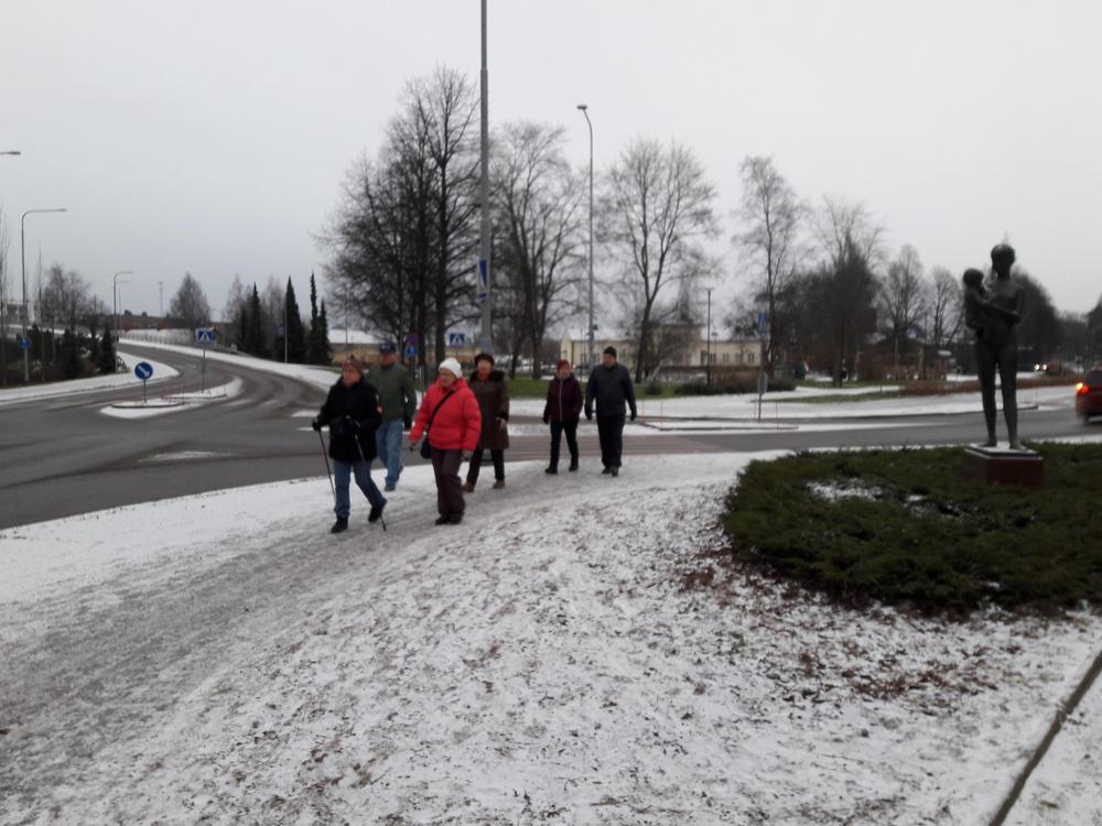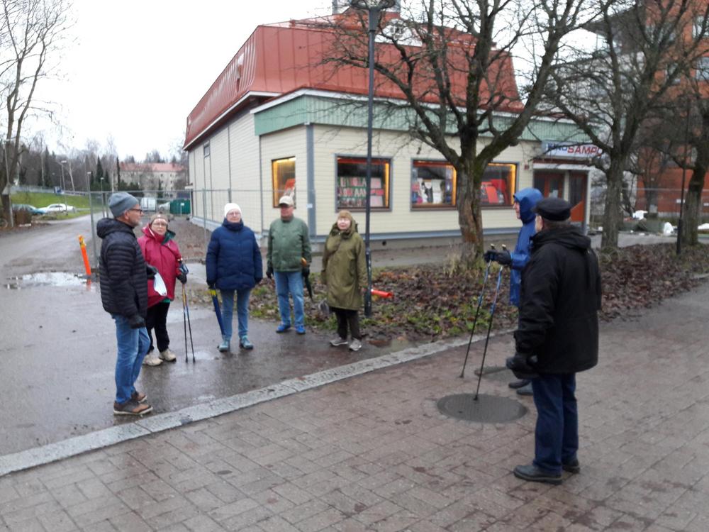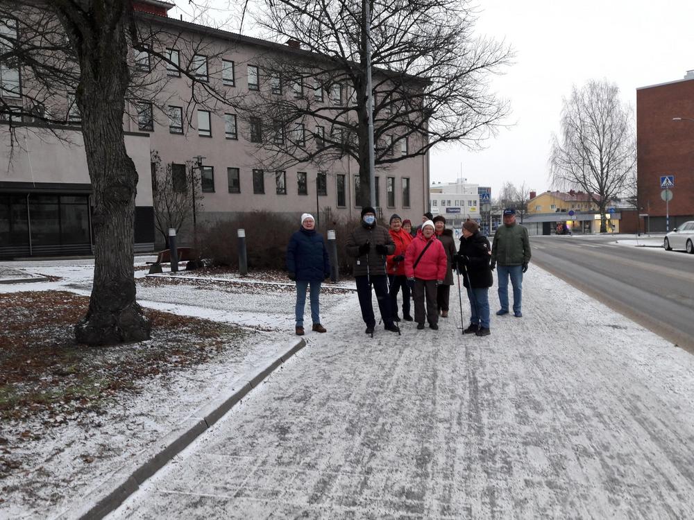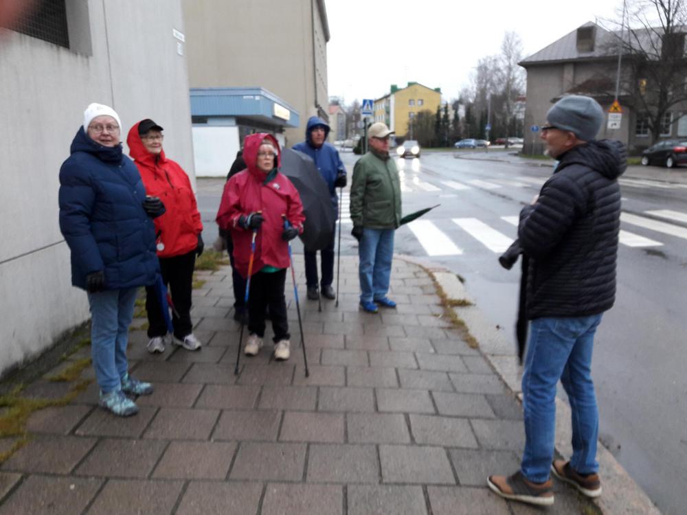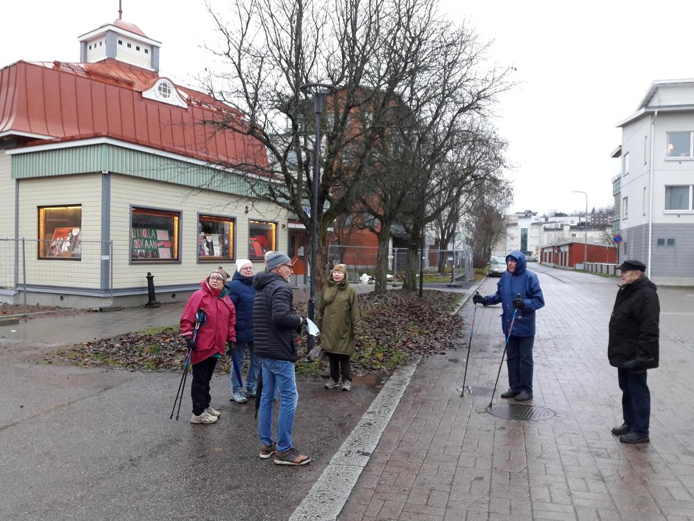 Tiistaina 17.11. kosteaan säähän oli uskaltautunut 9 senioria. Reitti kulki Topparoikka-patsaalta Valtakadun ja Koulukadun kautta kuntoradalle. Täältä laskeuduttiin Karankadulle ja sieltä edelleen Pohjoisen Rautatienkatua Kino Sammolle. Matkalla Niemisen Raimo kertoi reitin varrella olevien paikkojen historiasta.