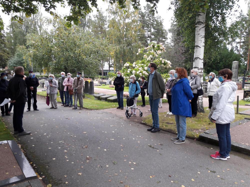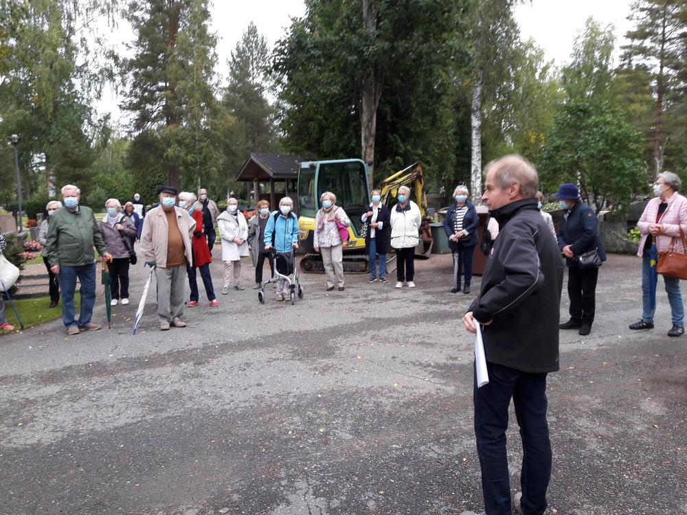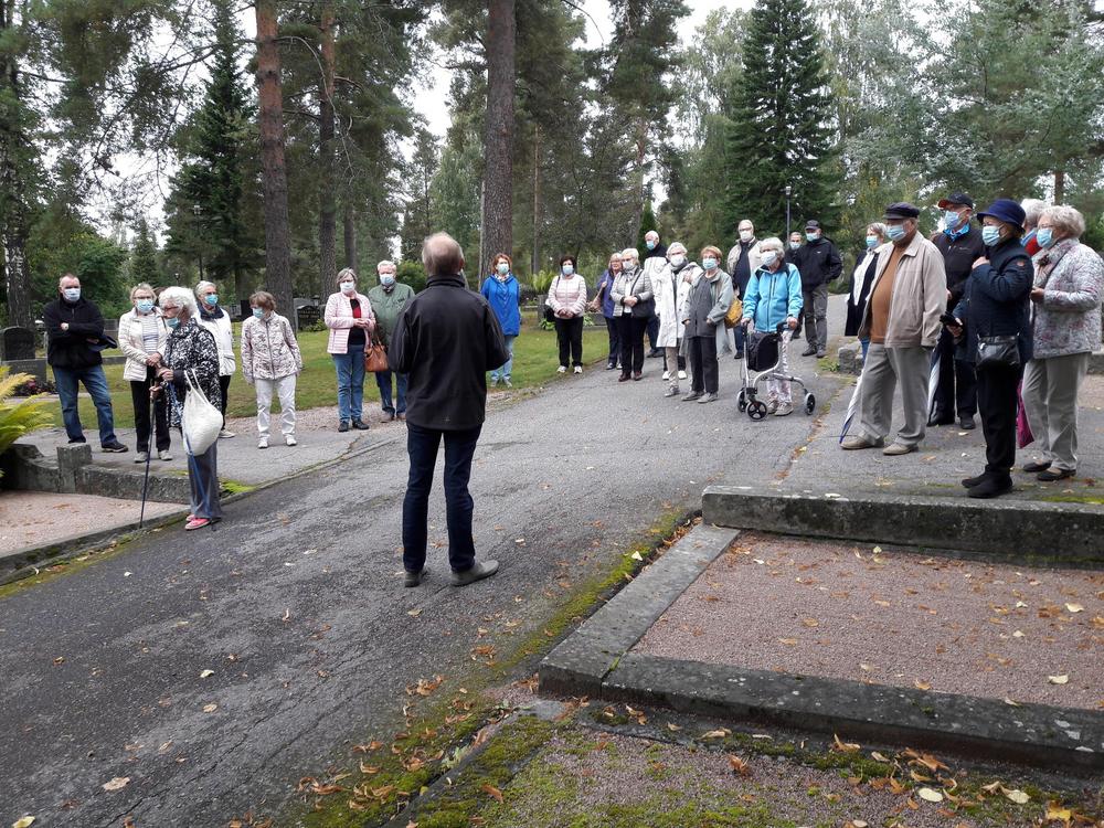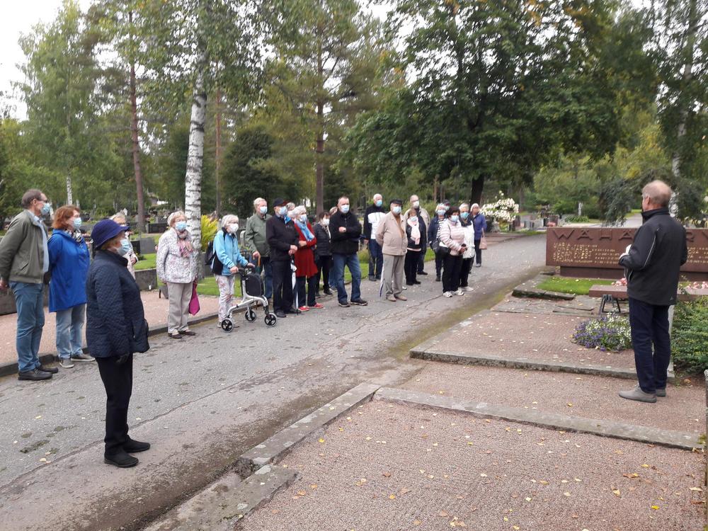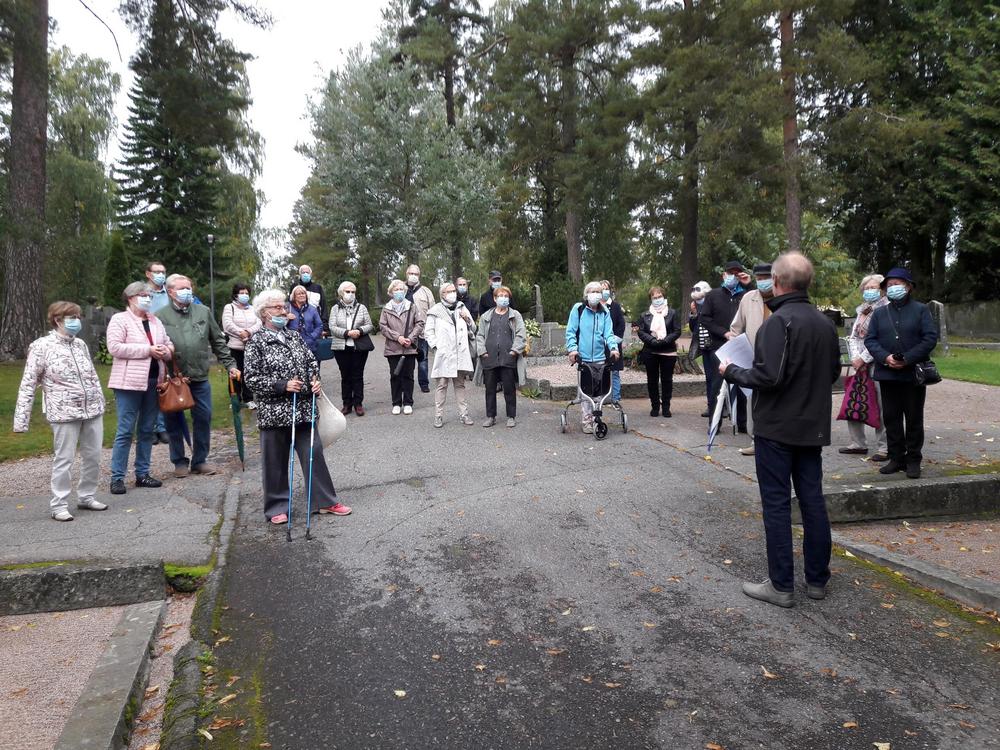 Koronasuosituksia noudattaen, avasimme syyskauden tutustumalla hautausmaan historiaan rovasti Kalervo Huttusen opastuksella. Poutainen sää suosi tapahtumaa, johon osallistui runsaat 30 innokasta kävelijää.