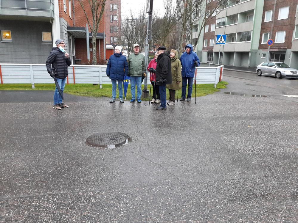 Tiistaina 1.12. suuntasimme kulkumme Peltosaareen. Kävelimme Peltosaaren sillan kautta Linnunradankatua pitkin Patastenmäen sillalle ja sieltä edelleen lähtöpisteeseen, Topparoikkapatsaalle. Aamuinen räntäsade taukosi, mutta se oli ehkä säikäyttänyt osallistujia joita oli yhteensä kuusi.