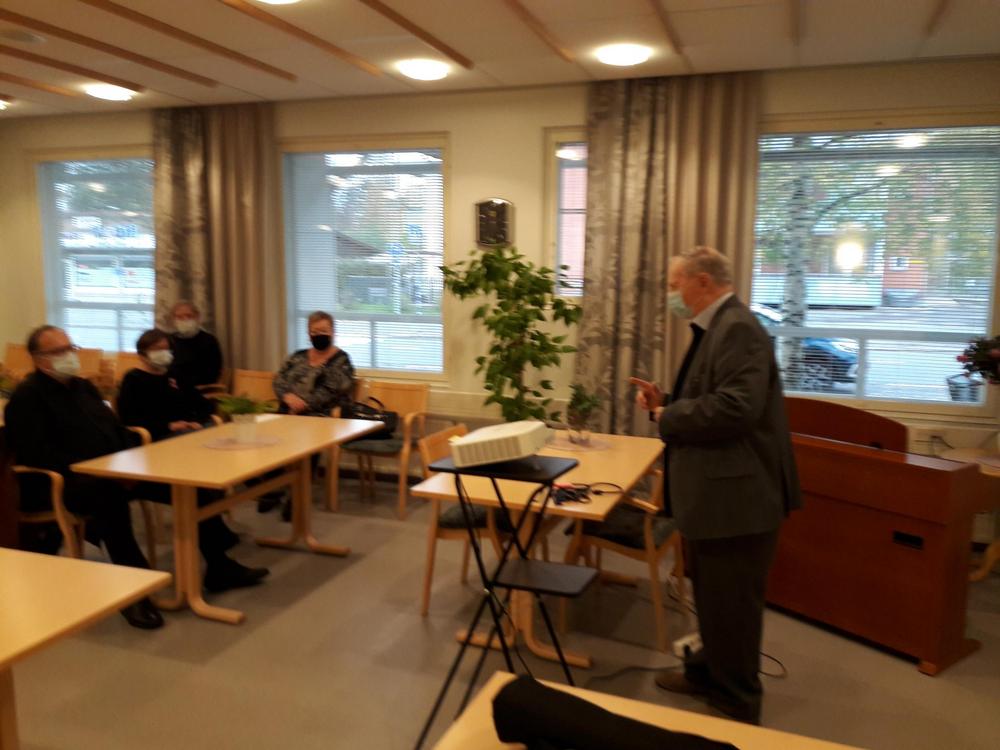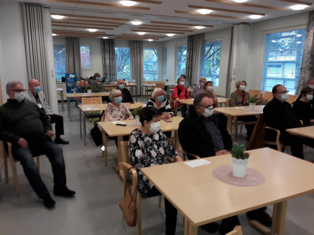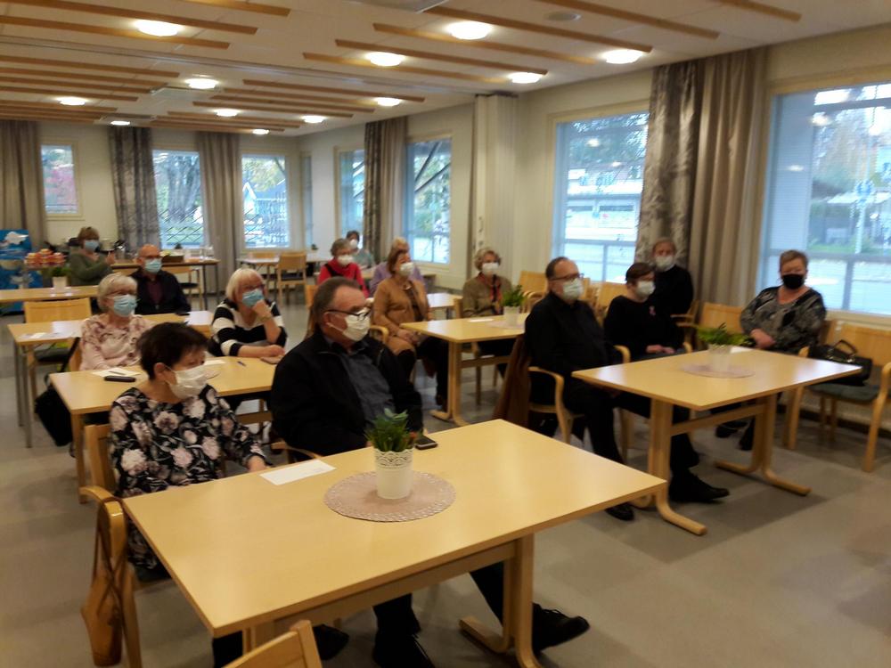 Lokakuun kuukausitapaaminen vietettiin koronarajoitusten puitteissa Inkilänhovissa. Paikalle oli uskaltautunut 18 senioria. Koronan takia ei ollut yhteislaulua, vaan sen sijaan Erkki viihdytti meitä soitollaan.