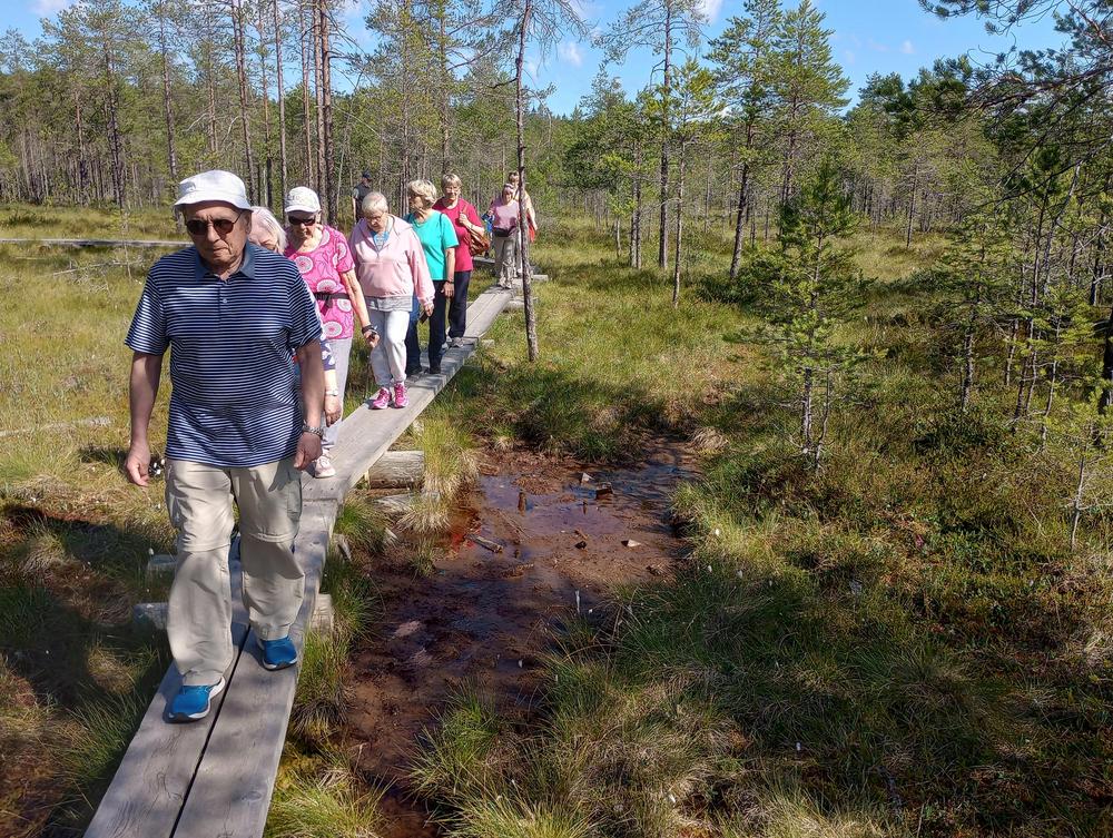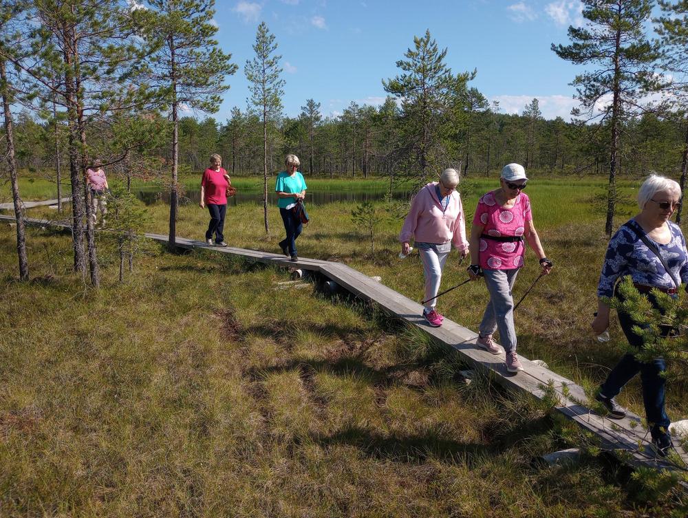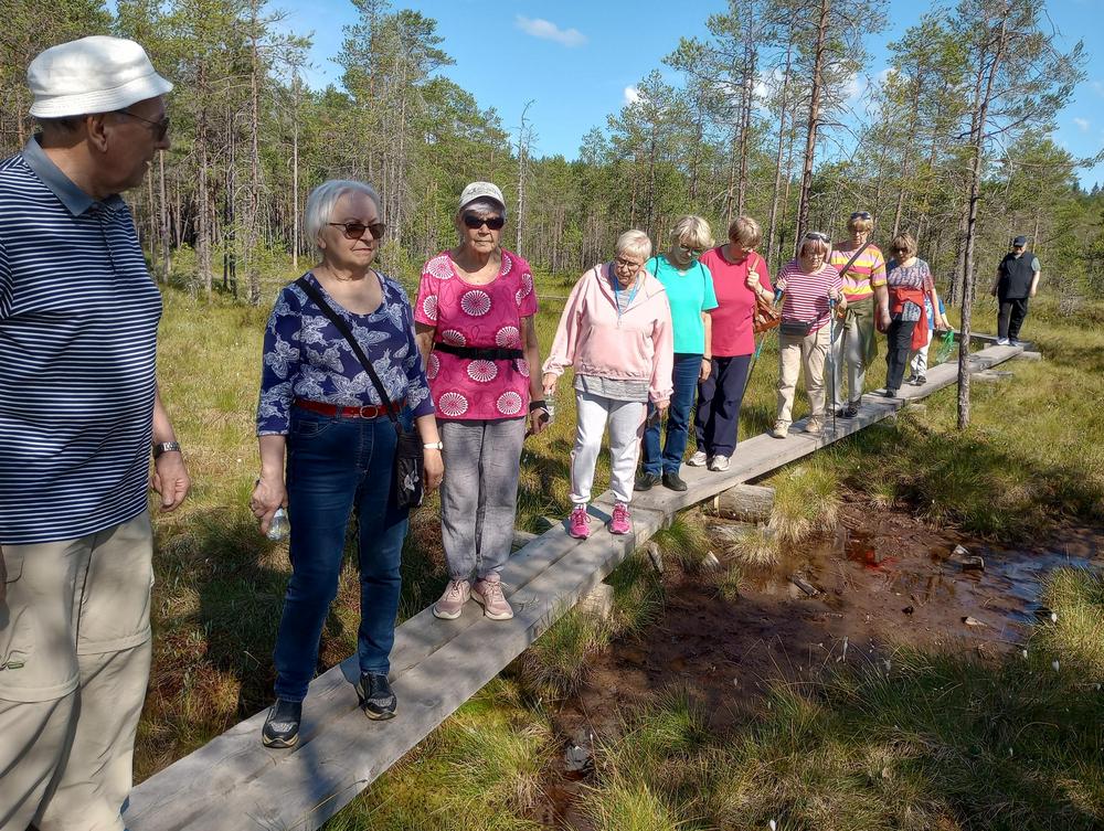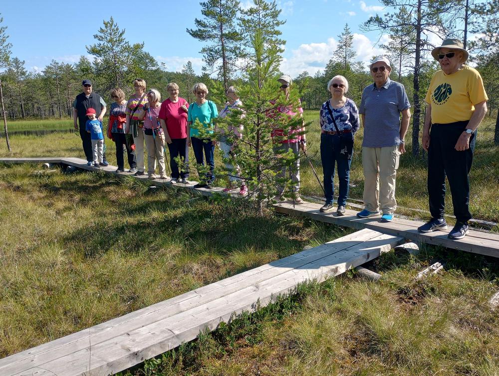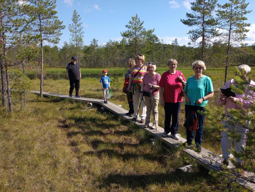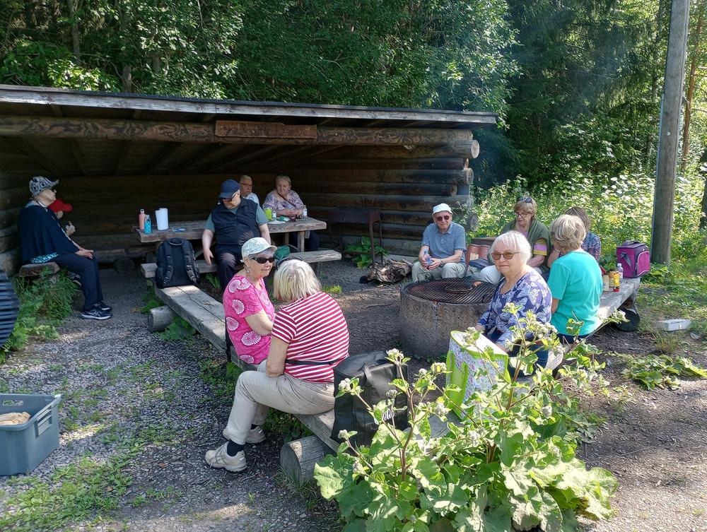 Tiistaina 11.7. tapasimme Hatlammin suon maastossa. Osa käveli pitkospuita pitkin suolenkin ja osa patikoi pururadalla. Tämän jälkeen ohjelmassa oli keskustelua makkaranpaiston lomassa. Kaunis sää suosi tapahtumaa, johon osallistui 14 henkilöa-
