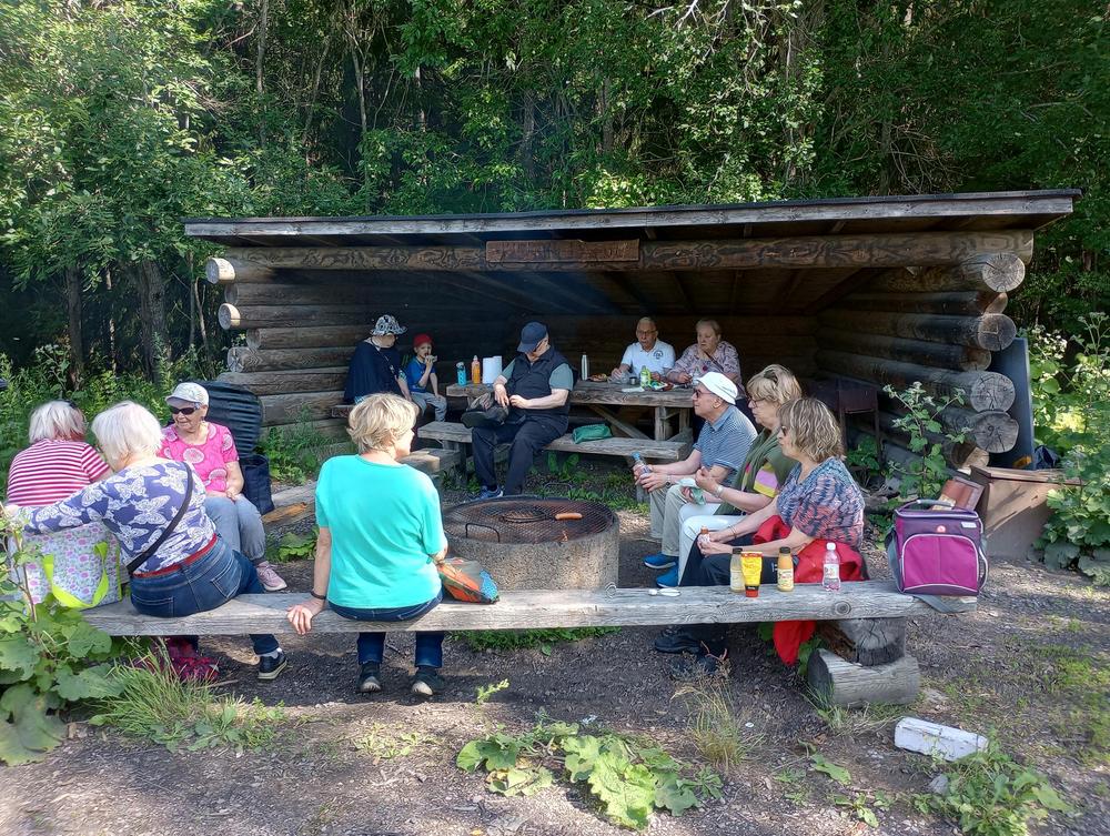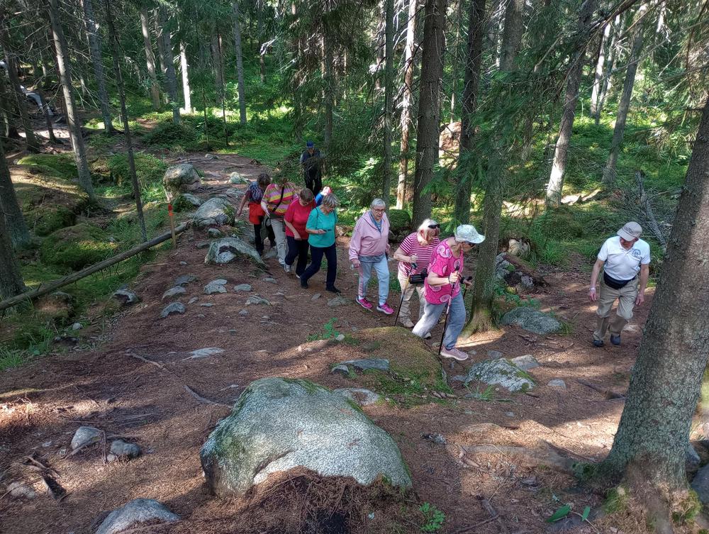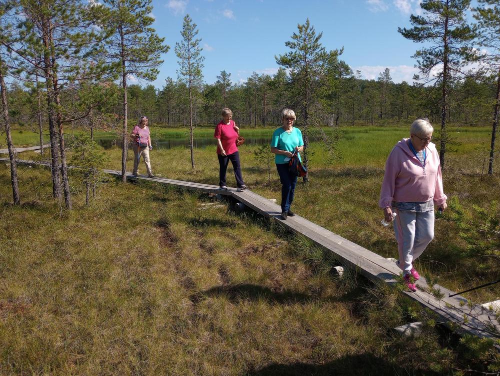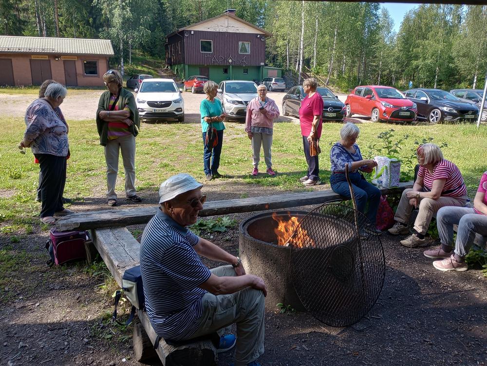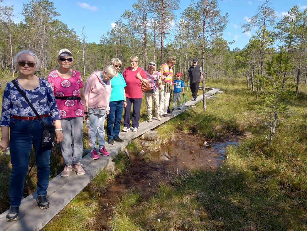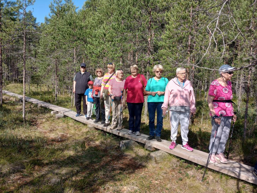 Tiistaina 11.7. tapasimme Hatlammin suon maastossa. Osa käveli pitkospuita pitkin suolenkin ja osa patikoi pururadalla. Tämän jälkeen ohjelmassa oli keskustelua makkaranpaiston lomassa. Kaunis sää suosi tapahtumaa, johon osallistui 14 henkilöa-