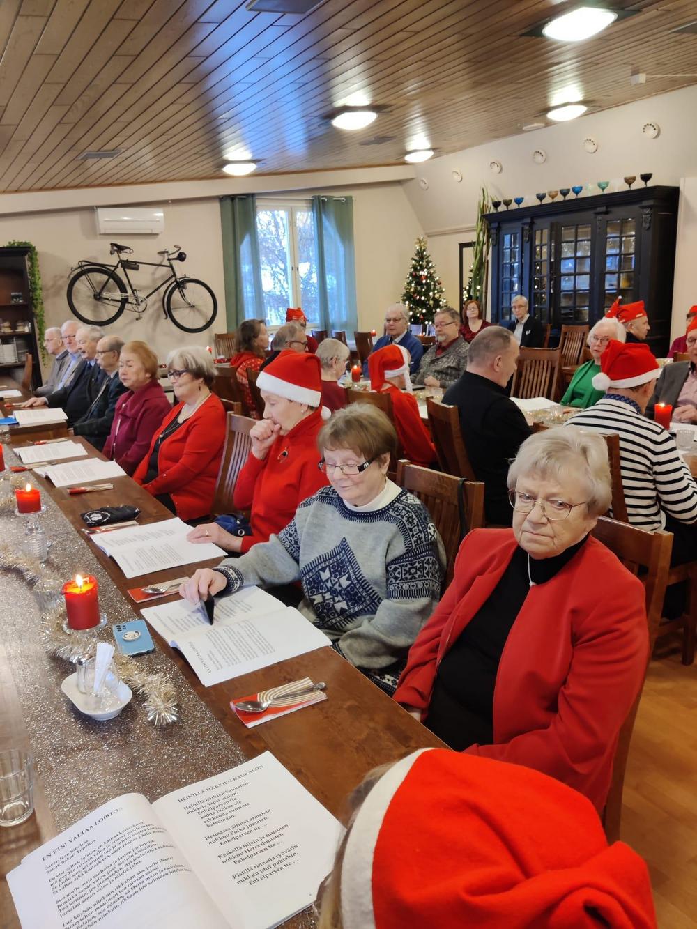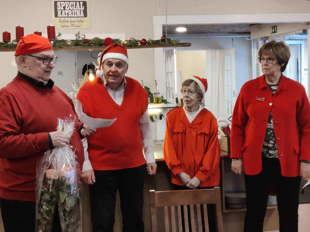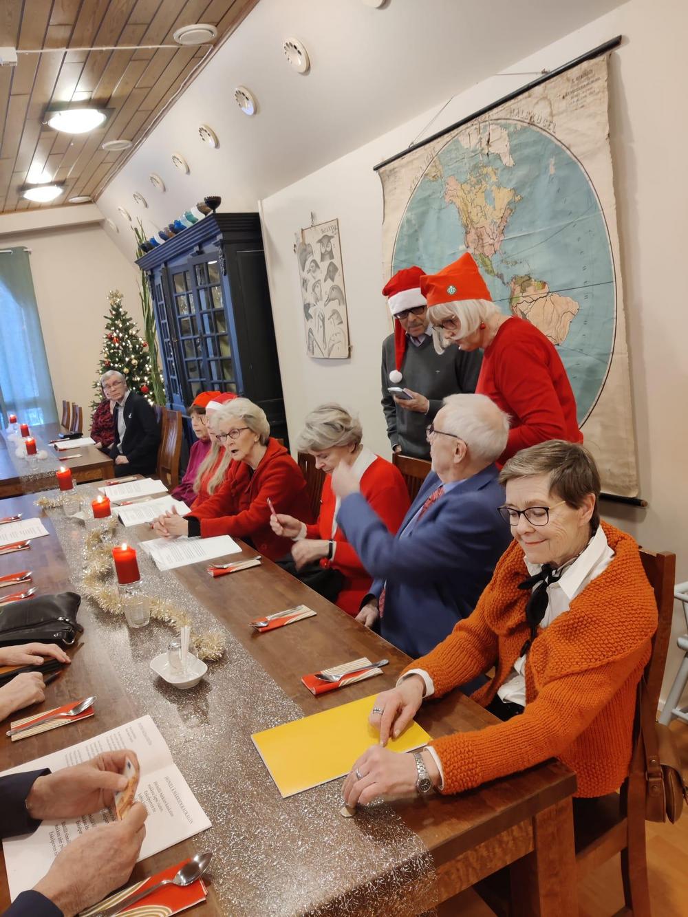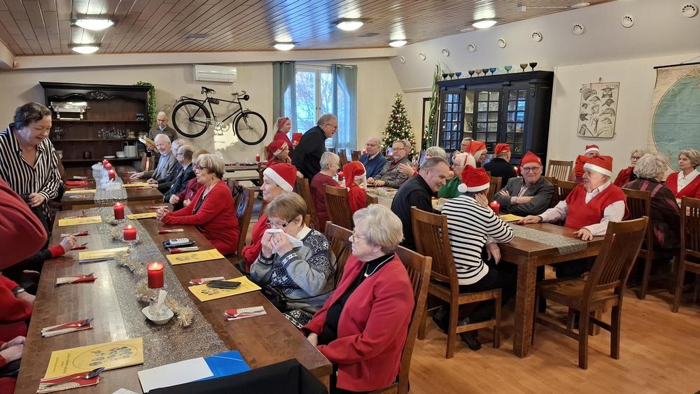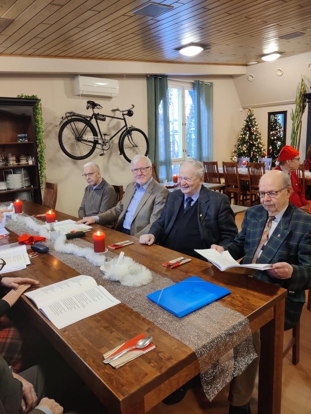 Keskiviikkona 11.12.2024 vuoden viimeinen kuukausitapaaminen Puurojuhlana ravintola Rucolassa. Tarjolla oli mm. glögiä, riisipuuroa ja täytekakkua, joista nauttivat kaikki paikallaolleet 49 senioria. Raimo Turtiainen & poika lauloivat ja laulattivat jouluisia kappaleita. Pj Jari Salonen lopetti kauttansa puheellaan ja kukitti ansioituneet. Uusi pj Aino Närkki korosti jatkuvuutta ja esitteli uuden hallituksen. Arvonnan voitti onnekkaasti Aino. Juhla oli mukavan lämminhenkinen.