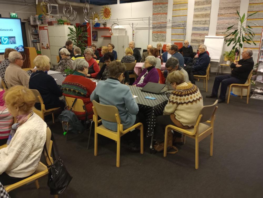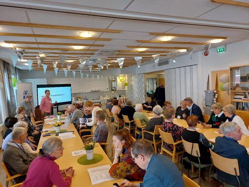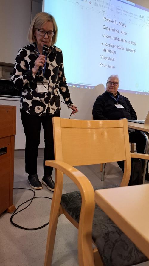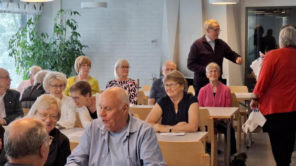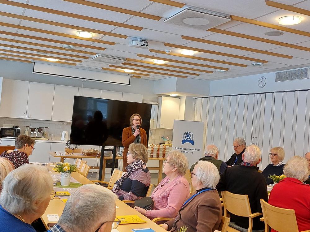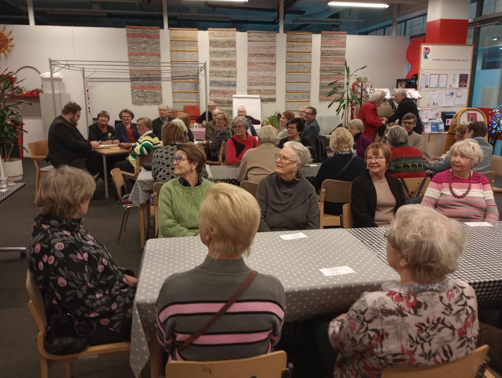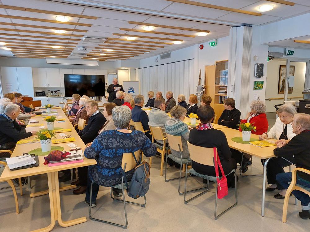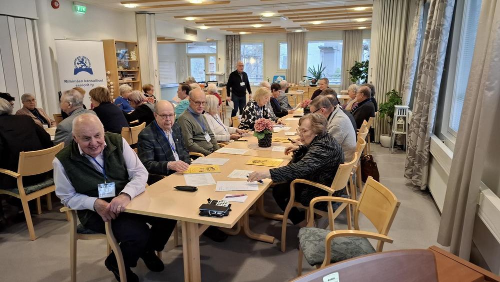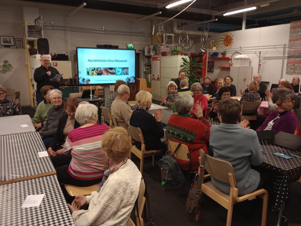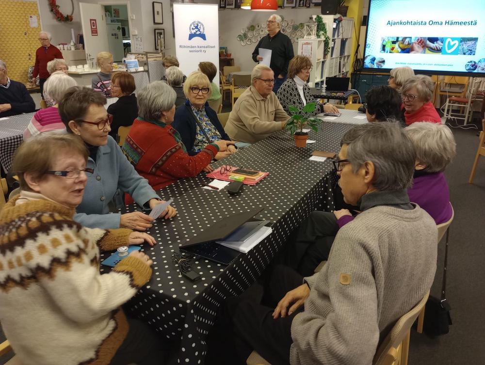 Keskiviikko 17.1.2024 Kokoonnuimme kauden 1. tapaamisessa Riksulassa. Pj Jari Salonen lausui avaussanat. Ohjelmassa oli pastori Juha Itäleinon tervehdys, poisnukkuneiden muistaminen ja hartaus. Aluevaltuutettu Aino Närkki kertoi ajankohtaista Oma Hämeestä. Maiju kertoi kevään 2024 retkikohteista, myös uusista. Ilkka esitteli uudistuneet kotisivut ja Senioriliitto -appsia. Päivi esitteli yhdistyksen uudet, avoimet Facebook-sivut. Tapaamiseen osallistui 44 senioria. Peculle kiitos ao. kuvien ottamisesta.