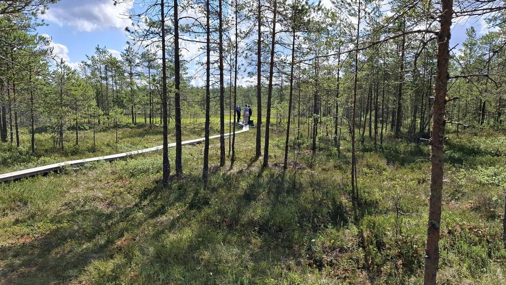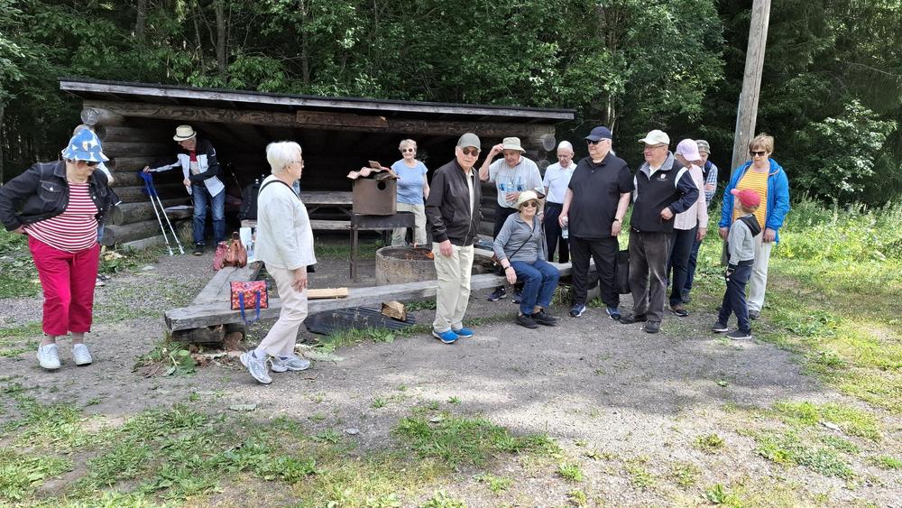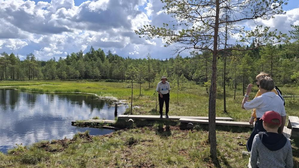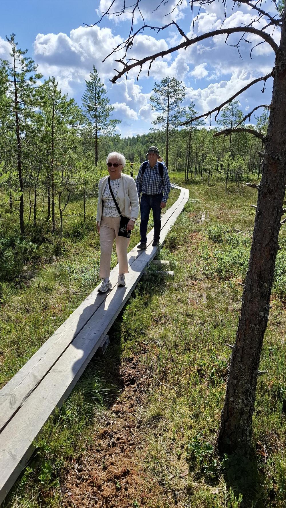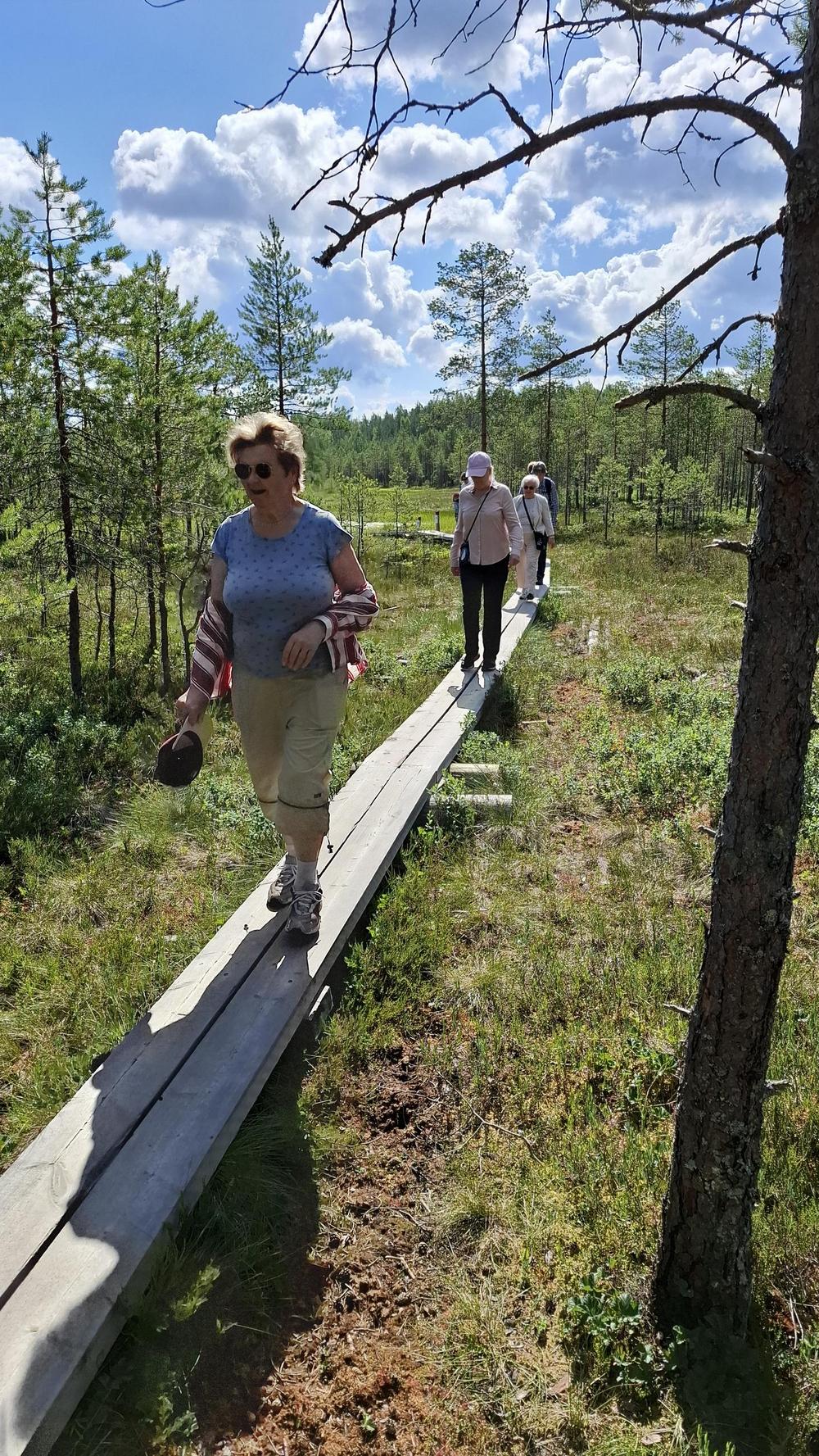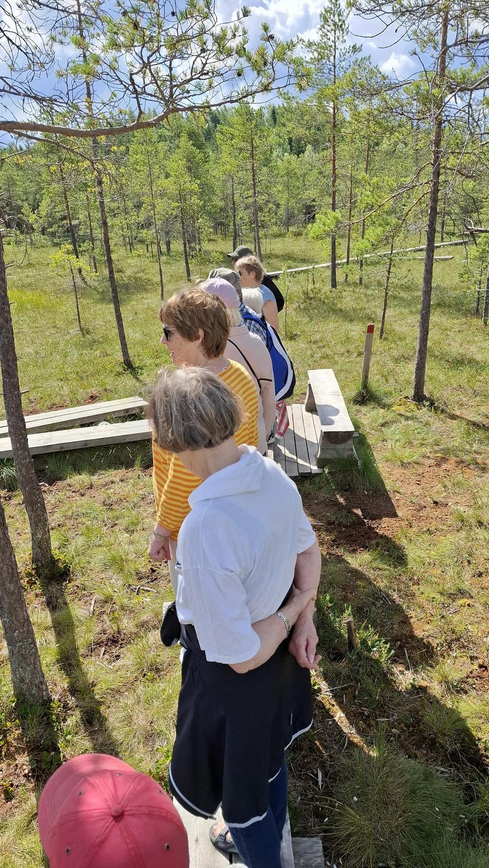Kevätkauden kolmas yhteiskävely 2.7.2024 Hatlammin suolla. Kaikilla 16 oli kivaa. Kuvia pitkospuilta ja laavulta.