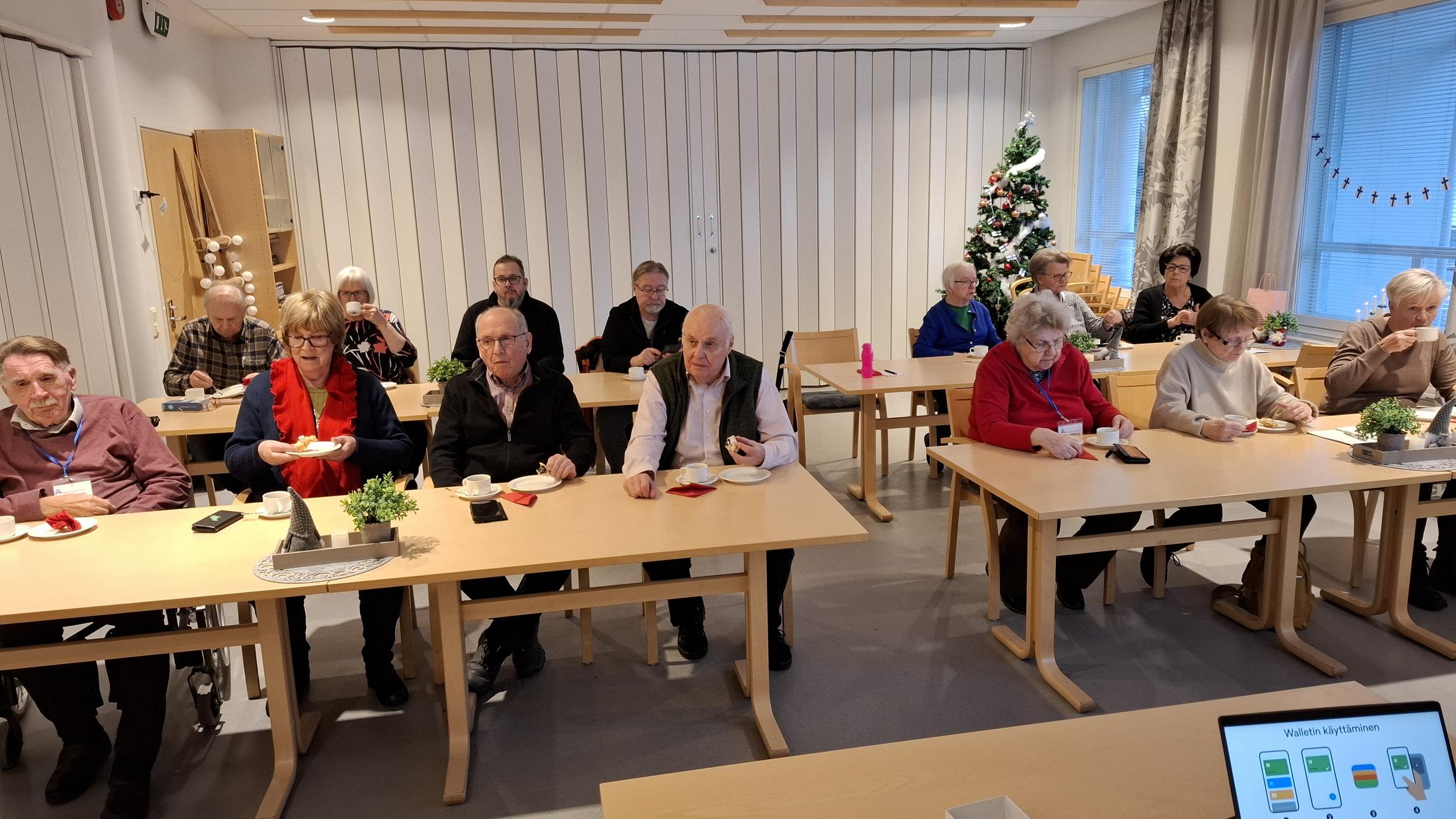 Joulukuun digikerhossa "Ajankohtaista tänään". Digikerhoomme osallistui 16 innokasta kävijää. Kävimme läpi mm. hoivaan liittyvää teknologiaa kertauksena ja maksukorttisovelluksia puhelimessa ja tekoälyä lyhyesti.