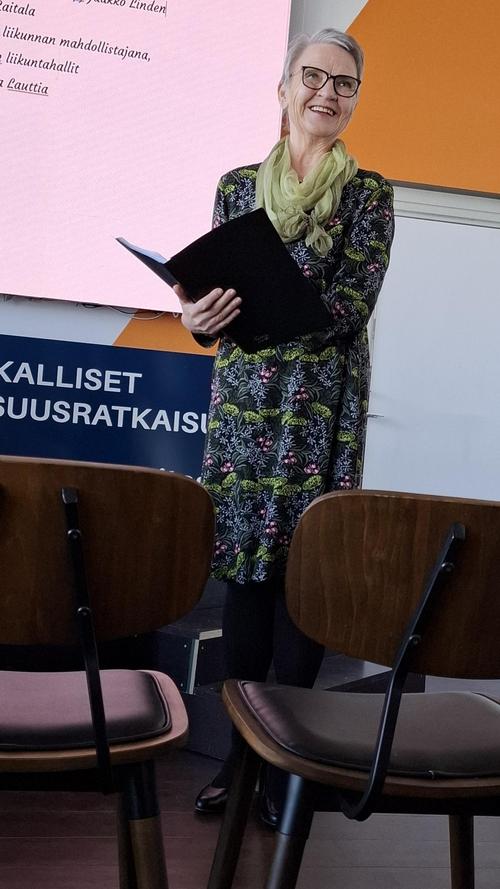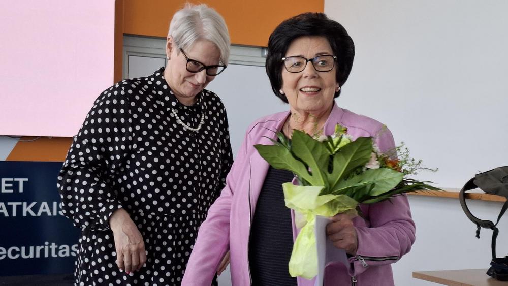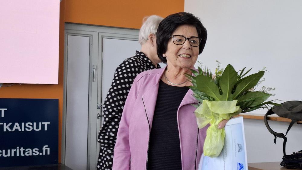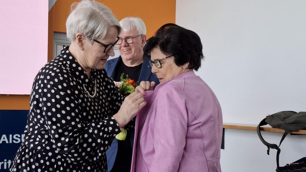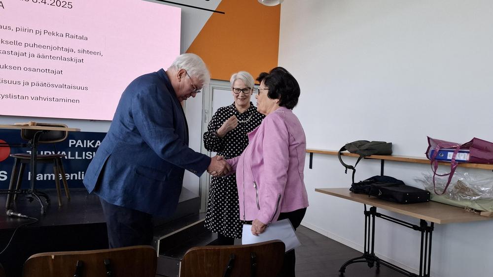 Pj Pekka Raitala ja Lea Raitala onnittelivat sydämellisesti kultaisella ansiomerkillä Maija Sumia Riihimäen kansallisista senioreista hänen panoksestaan piirin taloudenhoitajana.