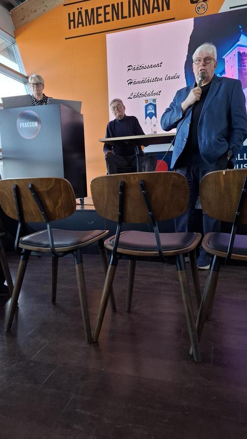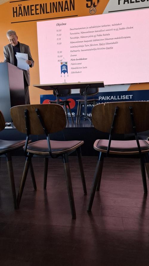 Kevätkokoukseen osallistui 29 virallista (34 kaikkiaan) jäsentä piirin eri yhdistyksistä. Päivän ohjelma alkoi Hämeenlinnan paikalliskuulumisilla Jaakko Lindenin kertomana. Jaakko on Hämeenlinnan senioreiden pj. Hämeen piirin pj Pekka Raitala esitti tervehdyksen ja pyysi miettimään piirin toimintamalleja. Hämeenlinnan liikuntahallien toimitusjohtaja Tuire Järvinen kertoi ikäihmisten liikuntamahdollisuuksista. Kulttuuripanoksen antoi lausuntataiteilija Kristiina Lauttia runolausunnallaan.