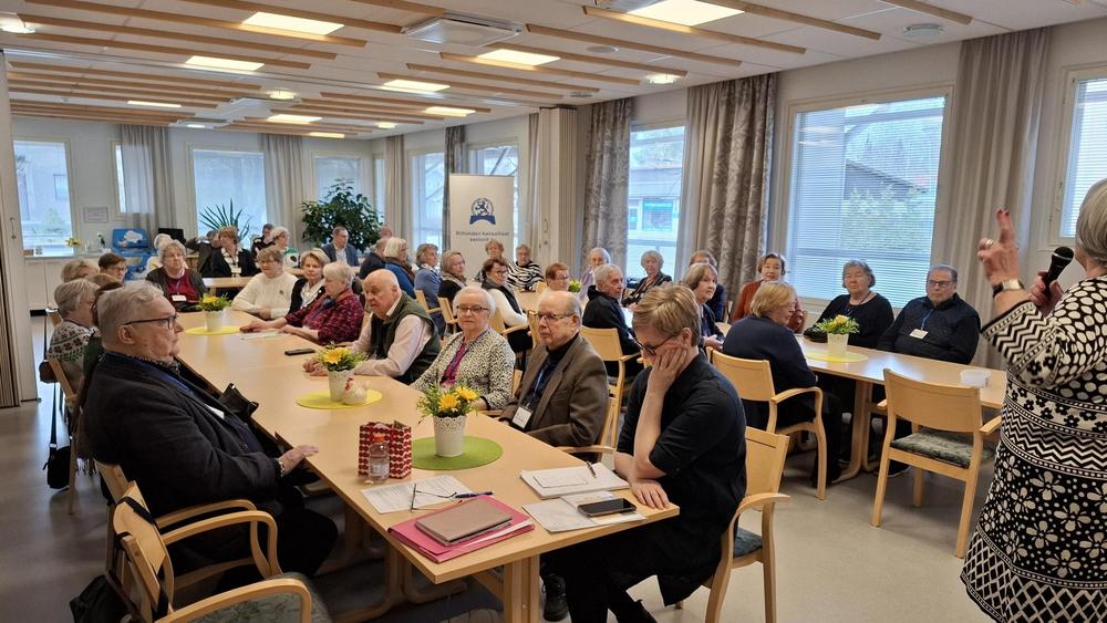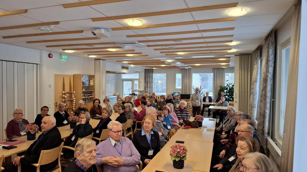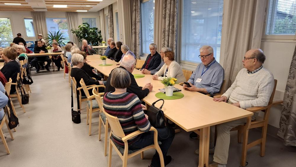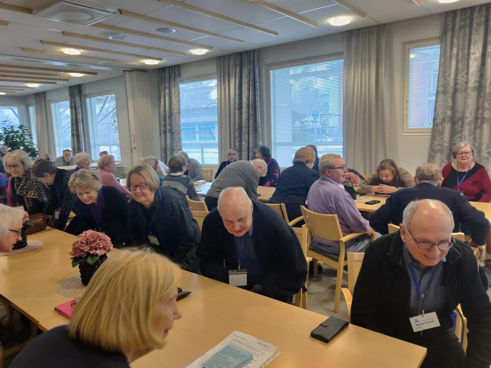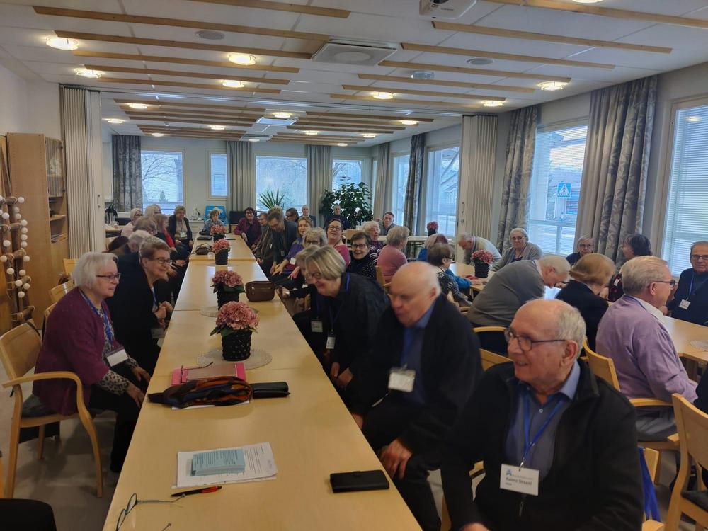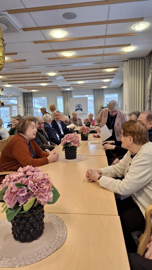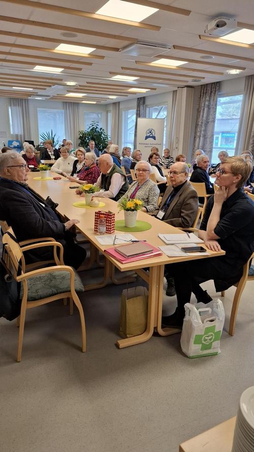 Keskiviikkona 12.3.2025 Kevätkokous kuukausitapaamisena Inkilänhovissa. Senioreita oli paikalla 46. Aluksi puheenjohtajamme Aino Närkki ja Päivi Lehtonen jakoivat ansiomerkkejä aktiiviseen toimintaan osallistumisesta seuraaville: hopeiset Jari Saloselle ja Eija Aittolalle sekä pronssiset Timo Heinoselle ja Raili Esselströmille. Kevätkokouksen veti Pirjo-Liisa Snellman-Tenhunen. Musiikillisen tietovisan junaili Päivi Lehtonen ja palkitsi parhaan ryhmän. Kesäkuun Tarton retken kuvaesittelyn piti Marjut Mikkonen. Näistä kaikista löytyy kuvia alla.