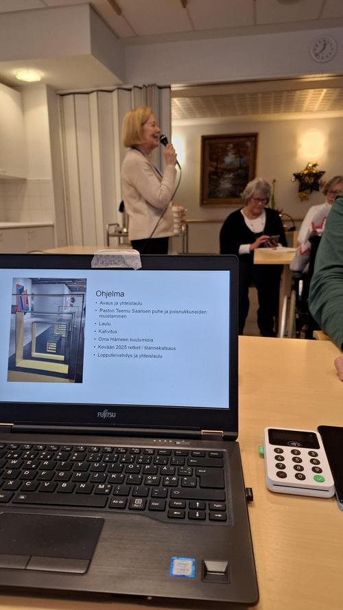 Pj Aino Närkki aloitti kautensa, toivotti kaikki ystävällisesti tervetulleiksi ja korosti kiitollisuutta sekä yhdessä oloa. Johtava kappalainen Teemu Saarinen piti puheen ja poisnukkuneiden muistamisen. Aino kertoi OmaHäme-tilannekatsauksen ja Marjut kertoi kevään retkistä.